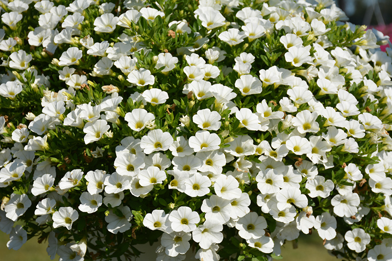 Callie® White Calibrachoa is smothered in stunning white trumpet-shaped flowers with yellow throats at the ends of the stems from late spring to early fall. Its small pointy leaves remain green in color throughout the season.