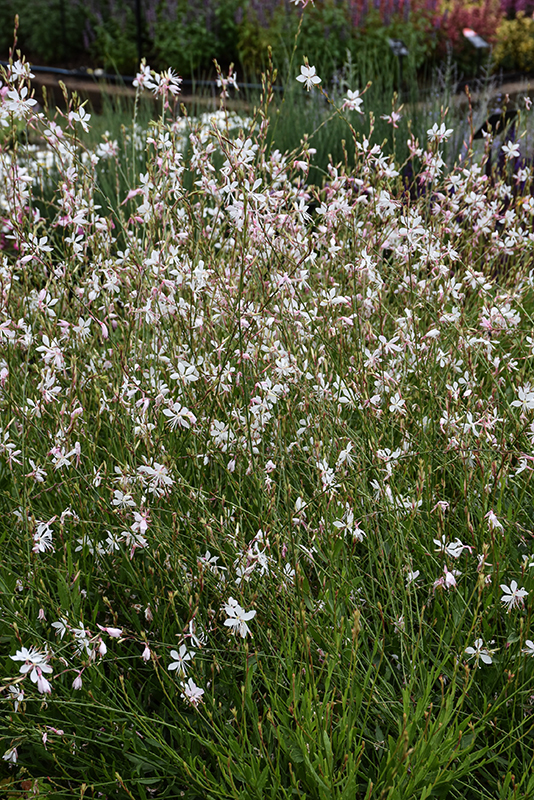 Sparkle White Gaura features airy spikes of white star-shaped flowers rising above the foliage from late spring to early fall, which emerge from distinctive pink flower buds. The flowers are excellent for cutting. Its narrow leaves remain dark green in color throughout the season.