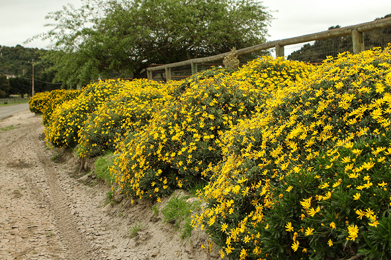 A striking, floriferous accent plant, forming a compact, bushy mound, topped year-round with golden-yellow blooms; peak flowering fall through spring; great as a low flowering hedge in mild climates; ideal in hot dry beds and borders