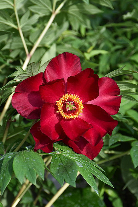 Scarlet Heaven Itoh Peony features bold lightly-scented semi-double scarlet flowers with gold anthers at the ends of the stems in late spring. The flowers are excellent for cutting. Its compound leaves remain green in color throughout the season.