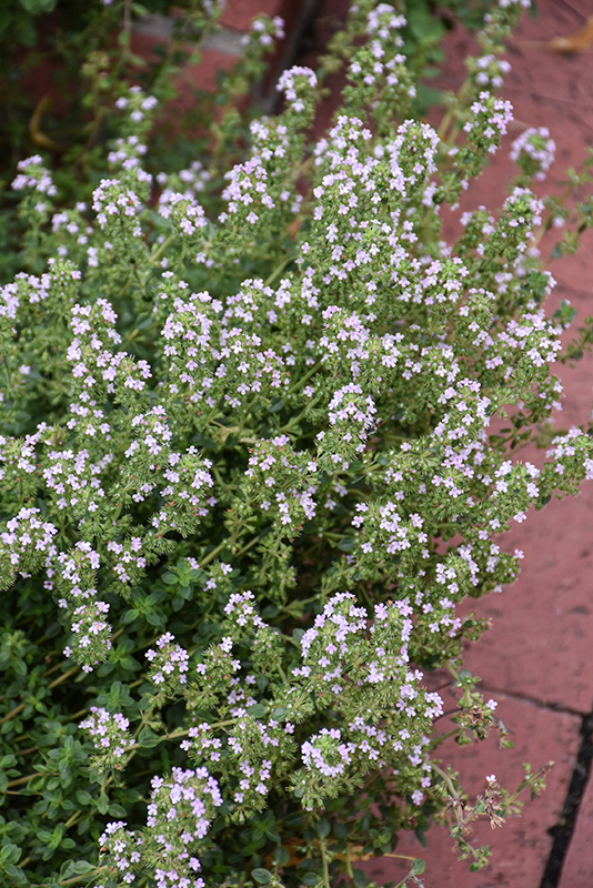 Common Thyme will grow to be only 6 inches tall at maturity extending to 8 inches tall with the flowers, with a spread of 24 inches. When grown in masses or used as a bedding plant, individual plants should be spaced approximately 18 inches apart. Its foliage tends to remain low and dense right to the ground. It grows at a fast rate, and under ideal conditions can be expected to live for approximately 10 years. As an evegreen perennial, this plant will typically keep its form and foliage year-round.