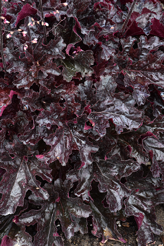 Large mounds of glossy black, ruffled foliage add contrast and intrigue to garden beds and borders; pink flower buds on tall scapes open to white bell flowers with pink backs; thrives in partial shade but can tolerate full shade