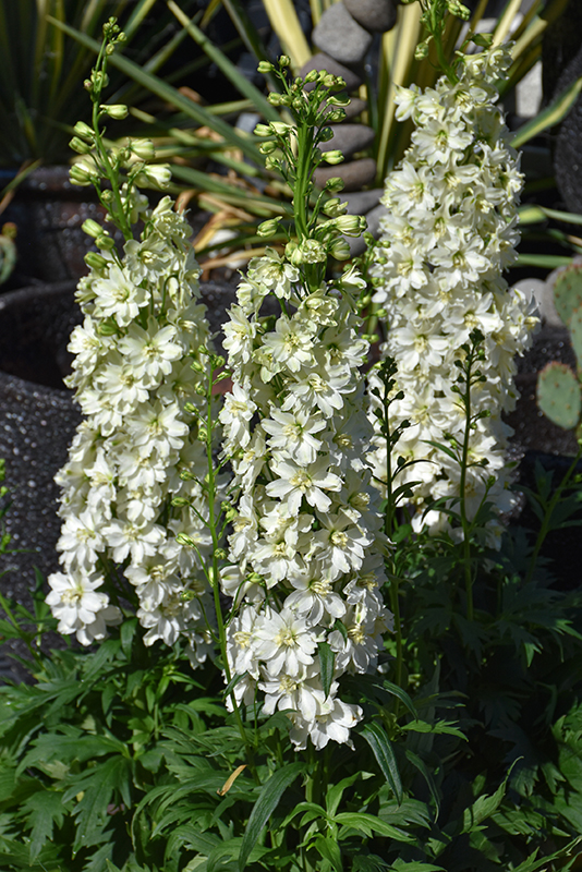 Delgenius® Neva Larkspur features bold spikes of double white flowers with creamy white centers rising above the foliage from early to late summer. The flowers are excellent for cutting. Its deeply cut lobed leaves remain dark green in color throughout the season.