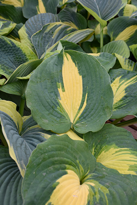 Creamy white to pale yellow center variegated with wide blue-green margin; slightly cupped foliage; dainty white flowers; provides beautiful texture and contrast to other plants