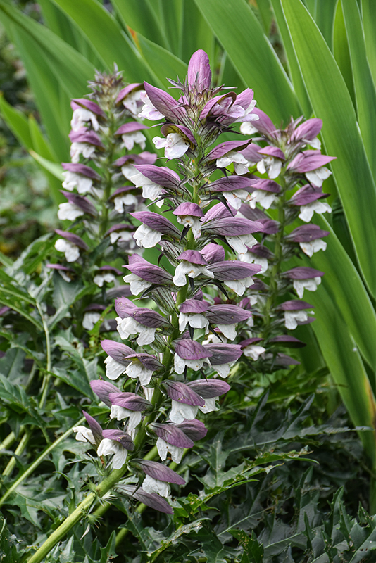 Bear's Breeches features showy spikes of pink hooded flowers with white overtones rising above the foliage in late summer. The flowers are excellent for cutting. Its attractive large spiny lobed leaves remain forest green in color throughout the year.